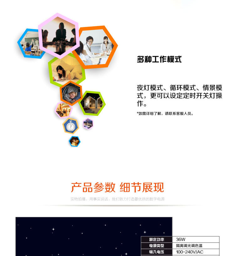 多種情景,高檔舒適:實現分段/無級調光。小夜燈模式,循環演示模式,定時開關模式,各種情景照明模式,讓整個燈光環境變得更加生動,打造個性化的燈光模式。
