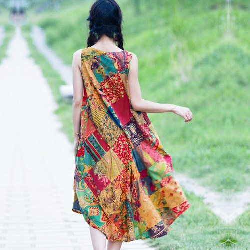 復古民族風裙子 拼色寬松休閑顯瘦連衣裙 棉麻連衣裙 廠家直銷
