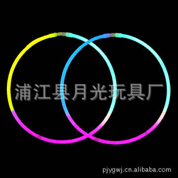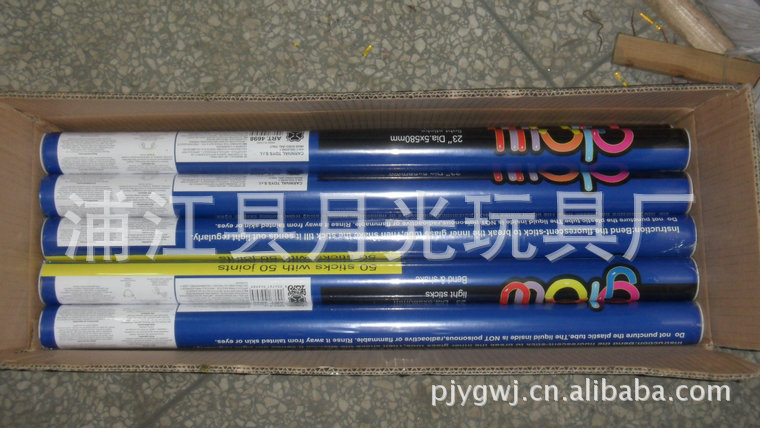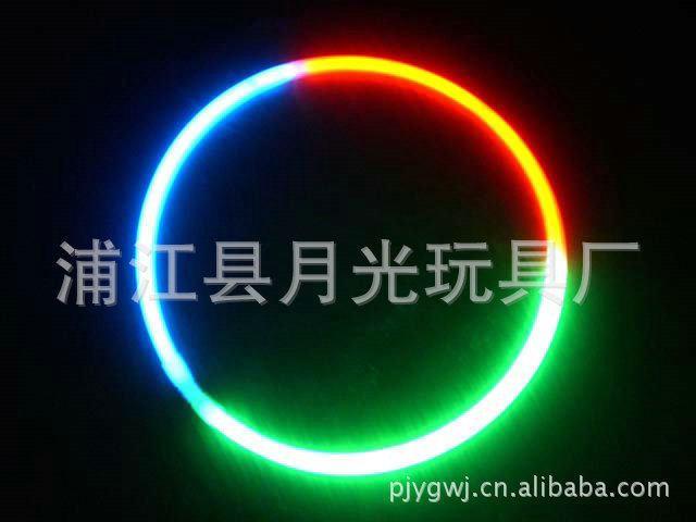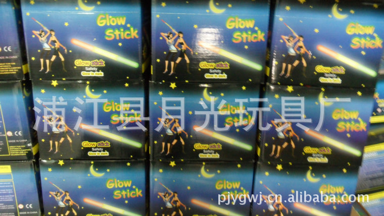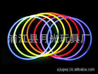 月光玩具廠位于浙江浦江縣, 我廠生產的熒光棒是國際上流行的新型光源,它不需要電源,由化學能直接轉化為光能,具有各種規格:手鐲5MMX200MM、6X200MM。項圈5MMX580MM、6MMX580MM。主要產品有發光大棒、發光手鐲、發光項圈、4英寸、6英寸發光棒。顏色具全,有紅、橙、藍、黃、綠、紫等多種顏色,可持續發光5-24小時不等,質量穩定可靠,保質期長達兩年以上。