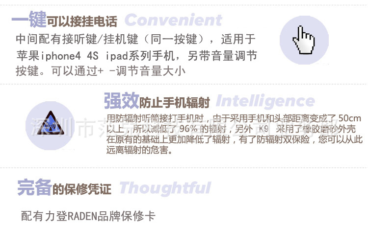 本產品是一款時尚拉風的iphone手機專用話筒,它除了可以接聽電話,隨意DIY,涂鴉自己喜歡的圖案,還可以聽廣播、音樂、MP3。重要的是他可以排除用手機直接接聽的噪音干擾,聲音清楚響亮,也同樣的避免輻射。走在路上感覺自己很受人注意,拉風與眾不同。