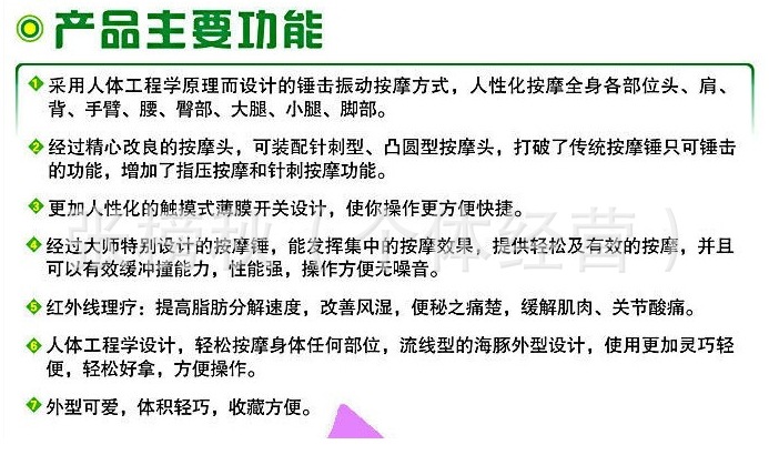 詳細介紹:本產品外形設計為大型按[mo]器,力度更大,按[mo]部位更多,可充分按[mo]頸椎、肩膀等部位;另配8個按[mo]頭,腰部及腿部等部位進行重點按[mo]