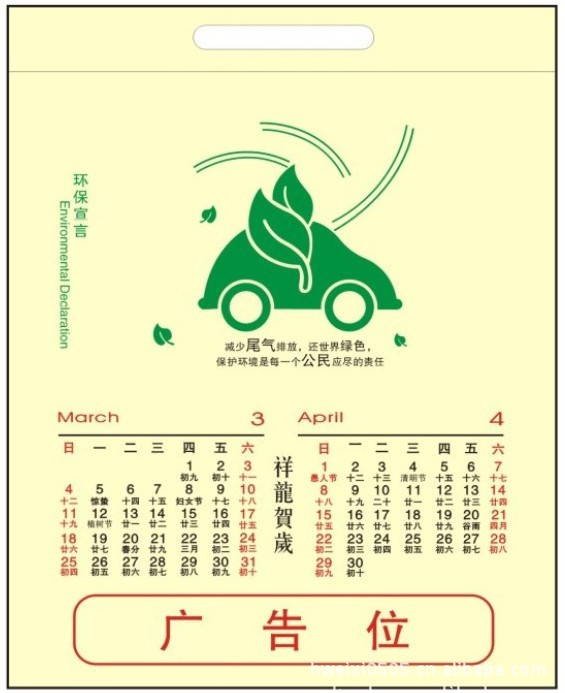 無紡布掛歷由7個無紡布袋裝訂組成,掛在墻上可當掛歷使用,拆下來可單環保袋使用,既環保又實用,產品可以按要求制作尺寸,印刷商標,非常適合拿來做促銷禮品、廣告禮品?,F在大家都在講環保,講低碳。而我們的環保掛歷采用的是布料循環利用制作成的無紡布,取材用意新穎,美觀兼具資源二次利用的環保主張,開創了掛歷新風尚,獨特的產品設計已獲國家實用新型專利,是企業展示低碳經營發展理念與友情饋贈之佳品。