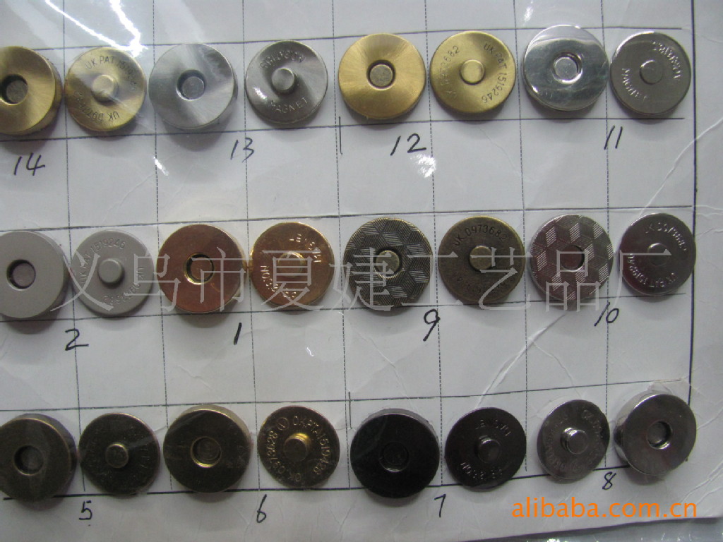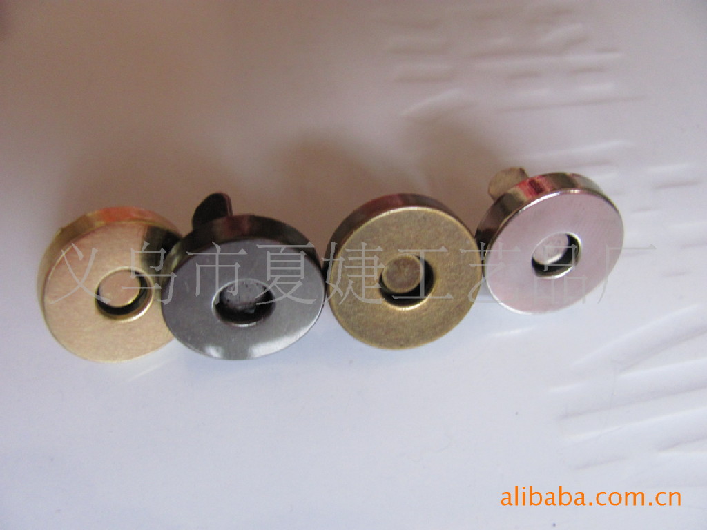 你好,我廠專業生產各種磁扣,磁按扣,厚的直徑1.0CM 1.4CM 1.5CM 1.8CM ,超溥直徑:1.0 CM 1.2 CM 1.4CM 1.8CM,電鍍各種顏色等等,常規規格我司倉庫備有大量現貨,以及各種規格的各種類型相框配件/家具配件/五金配件等,產品有:合頁、螺絲、角花、銅掛、包角、吊掛、角釘、片釘、直釘、帽釘、掛勾、 箱包包角,鎖扣,壓片,撥片,擋片;金屬彈片,瓜子片,月亮片; 掛片,三角掛鉤,掛鉤,葫蘆片;背扣,,相框合頁、雞眼,空心鉚釘,鉚釘,單面撞釘,雙面撞釘;角碼;五金拉手,箱包拉手,五金曲手,合頁鉸鏈,鐵合頁,小合頁,七字合頁,三叉合頁,