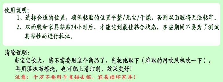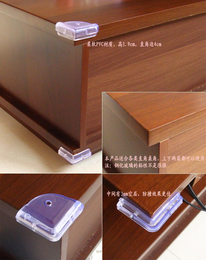 選用富有彈性的PVC精制而成,安全又美觀,即讓寶寶和您的家人免受碰撞之苦,同時又不妨礙家具整體造型。本品適用于一般家庭中的桌角、床角、書柜、樓梯角等位置。