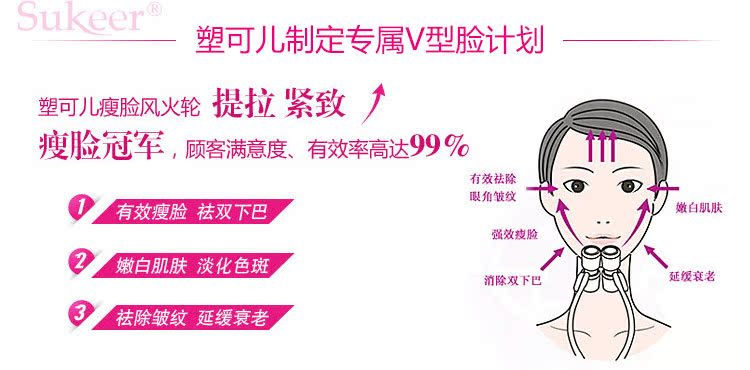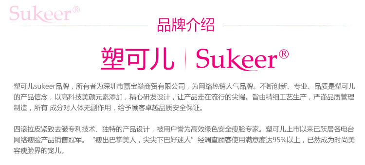 Sukeer塑可兒品牌,為深圳市嘉寶燊商貿有限公司創立。塑可兒瘦臉風火輪套裝是網絡熱銷的人氣品牌產品,專為期望瘦臉的人士設計。具有瘦臉、去除眼角皺紋以及鍛煉表情肌、減緩皮膚老化的美容功效,深受眾多女性青睞和關注。Sukeer塑可兒產品皆由精細工藝、嚴謹管理所生產,產品成分安全,并且對人體無任何副作用,給予顧客卓越品質安全保證。