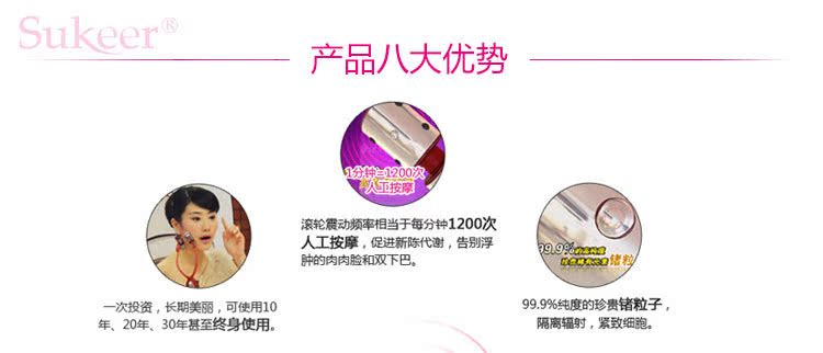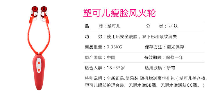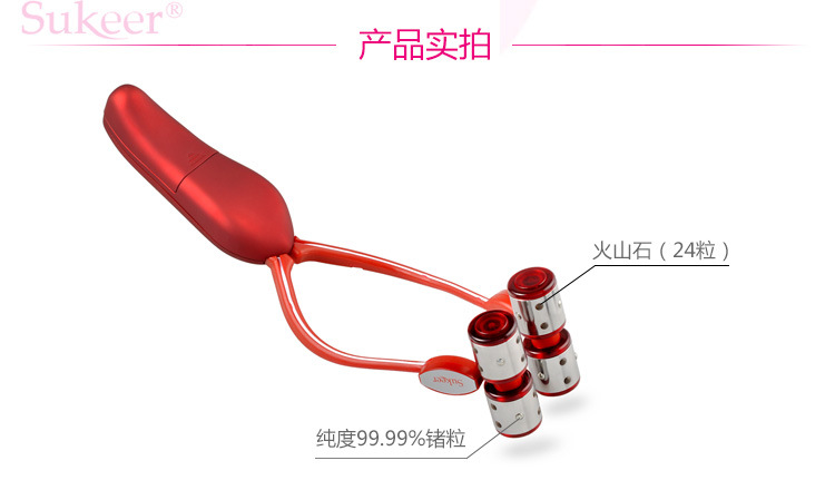 塑可兒瘦臉風火輪是從日本引進技術,在中國取得專利,專利號ZL6724.2。采用風火輪震動按[mo]臉部贅肉,配合純度99.9%鍺粒子和火山石循環推脂、燃脂,特別針對大圓臉、大肉臉、嬰兒肥,能有效瘦臉。內置2種模式冷光燈,冷光美容促進皮膚血液循環,排毒養顏;內含火山石粒,可以調節人體因過度疲勞和生活不規律引起的過量正電位。Y型風火輪滾輪設計,震動、按[mo]雙效合一。每天按[mo]9分鐘,隨時隨地輕松美容。在日本、韓國銷售非?;鸨?,顧客滿意度達到95%以上。