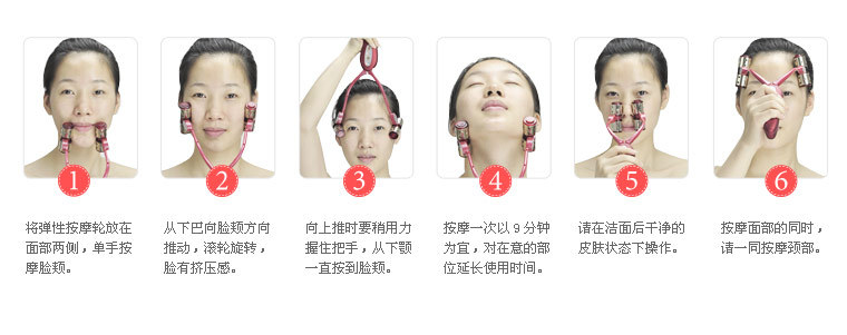 每天使用2-3次,每次9分鐘,可以單手使用瘦臉風火輪在臉部從太陽穴一直到下巴部位來回滾動,也可以針對額頭部位的皺紋和頸部的皮膚按[mo]。如果想要效果更顯著,可以增加使用次數。
