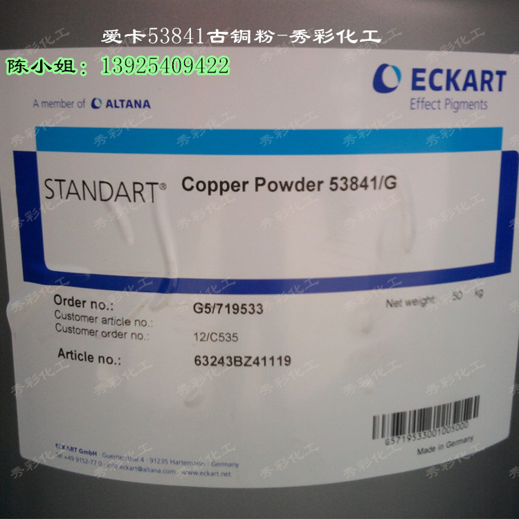 1. 佛山市秀彩化工有限公司供應愛卡CT古銅粉、愛卡AT古銅粉,德國進口800目古銅粉,進口耐高溫300℃古銅粉,AT/CT青金粉,AT/CT紅金粉,古銅粉也叫紫銅粉是一種浮型片狀顏料,由一定比例的銅、鋅和鋁合金,經熔煉、球磨、分級到所需要的規格和效果而成;古銅粉是純度的銅金粉,含銅量在99.999%左右,所以其價格也是銅金粉當中貴的。其產品主要是用在些仿阿古產品,表面的噴或涂都可以,效果很好。