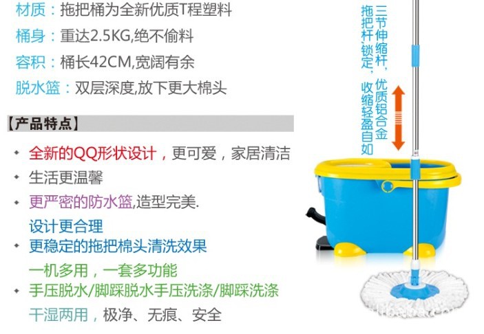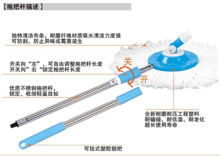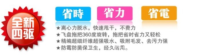 好神拖新型脫水裝置,可自行控制布條干濕度,兼具清潔、吸塵、吸水效果,省時方便,快速干燥更安全。新型拖把頭專利設計,可以360度任意旋轉,均勻清潔、輕松深入任何角落。 獨特布條纖維,強力清潔、耐磨抗菌,不會刮傷各式地板或其它清潔面的精致表面。超強省力/省時/更省電:創新概念,結合吸塵器與脫水機設計,擁有吸塵器般的強力清潔效果,同時也能達到百分之百完全脫水效果,不臟您的玉手,不費體力,不需插電,操作簡單,一套成型,大人小孩都上手。