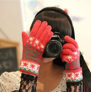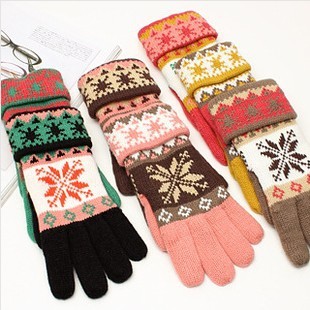 批發新款大雪花可愛保暖五指分指針織雙層毛線加厚手套女秋冬季