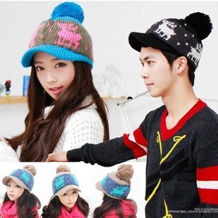 批發 秋冬韓版大絨球鴨舌帽針織毛線帽子 雪花 小鹿拼色鴨舌帽