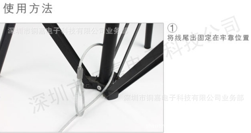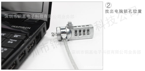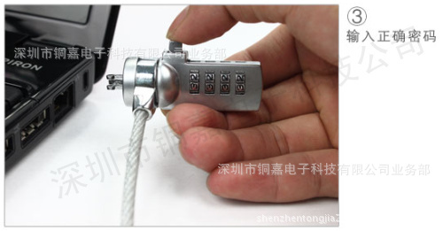 使用時只要把鋼繩固定于固定物上,鎖身從繩套中穿出,接到筆記本的鎖孔,鎖住鎖頭即可保證筆記本安全,防止主人沒注意時筆記本被別人拿走的情況。