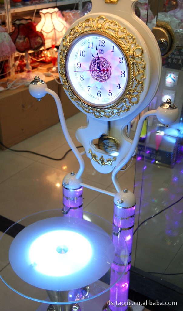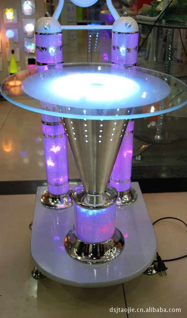 此款LED茶幾落地燈,充分運用了LED技術:(1)二個后支柱采用亞克力材質,其中融入LED電子;(2)中心支柱為鋁合金材質,內有環形發光管,上部有6層環形發光小孔,使得藍光環形撒射,同時藍光打到玻璃茶幾上,更是讓人心曠神怡,(3)中心支柱下方為亞克力圓柱,其中有LED控制器和閃光器,讓圓形亞克力支柱閃閃發光;(4)燈具中部采用精準的品牌時鐘顯示,四周有多個LED光源打到時鐘中央,反射出類似向日葵圖案。