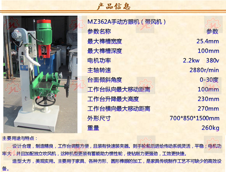 MZ362A手動帶風機方眼方孔機 方型榫眼鉆 立式單軸2.2KW大功率