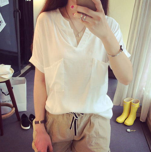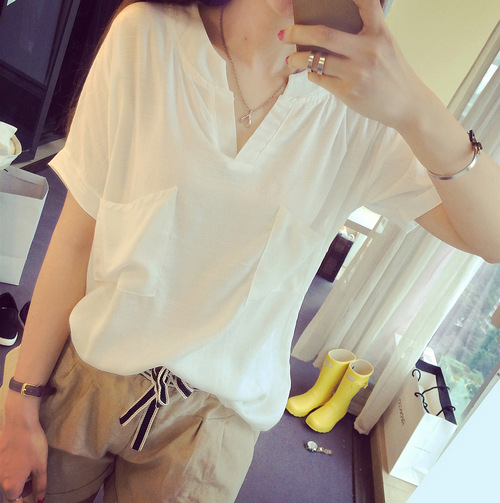 7086 文藝范上衣 寬松休閑大口袋 短袖V領隨性套頭女T恤