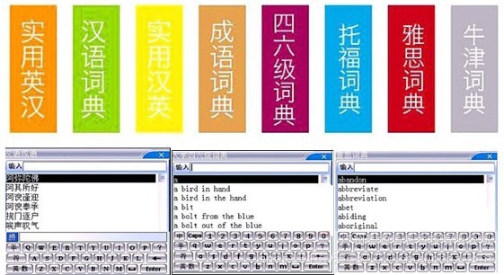 詞典欄目包括實用英漢、實用漢英、現代漢語、漢語成語、四六級、托福詞典、雅思詞典7本版權詞典,以及下載詞典功能。
