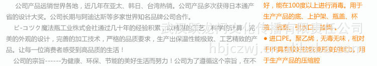 ピ-コツク魔法瓶工業株式會社通過幾十年的積累完善,以精湛的工藝,科學的計算,完美的外觀的設計,完善的加工技術,嚴格的品質要求,生產出保溫性能、工藝精致的保溫產品。讓每一位消費者感受到高品質的生活!