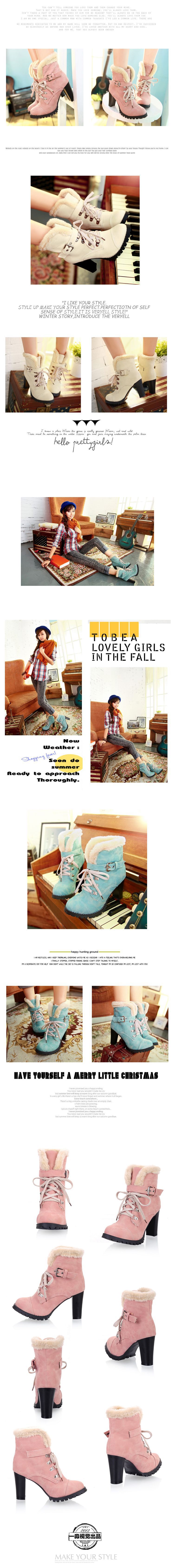 甜美糖果色交叉系帶搭扣高跟防水臺羊羔絨雪地靴馬丁靴