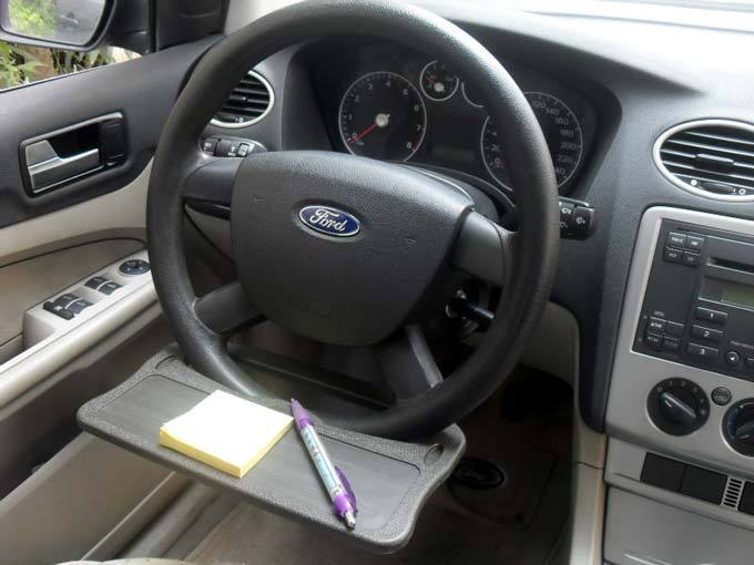 2.到位后,臺面下壓,使置物臺掛口在方向盤上。