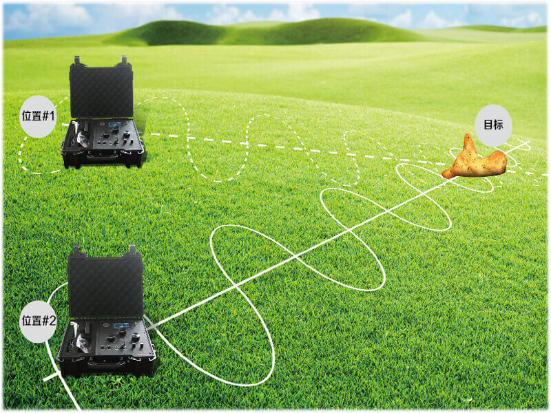 若存在目標物體,當我們走在目標物體和EPX10000地面探測器之間的傳輸線上時,兩桿就會完全交叉。此傳輸線對于單個目標物來說通常是15厘米寬。我們可以通過仔細檢查判斷其是否為穩定信號。這樣操作者需要返回、放松、再次移動到傳輸線上。若接收桿每次都會交叉,然后我們可以按照例2中的信號追蹤圖追蹤目標信號。當操作員穿過埋藏的物體后,將無任何顯示。目標物就位于最后一次桿交叉位置和無交叉顯示的位置之間。金屬探測器可用于對目標物體進行精定位。參照我們的示例,繼續練習以取得更好的效果。