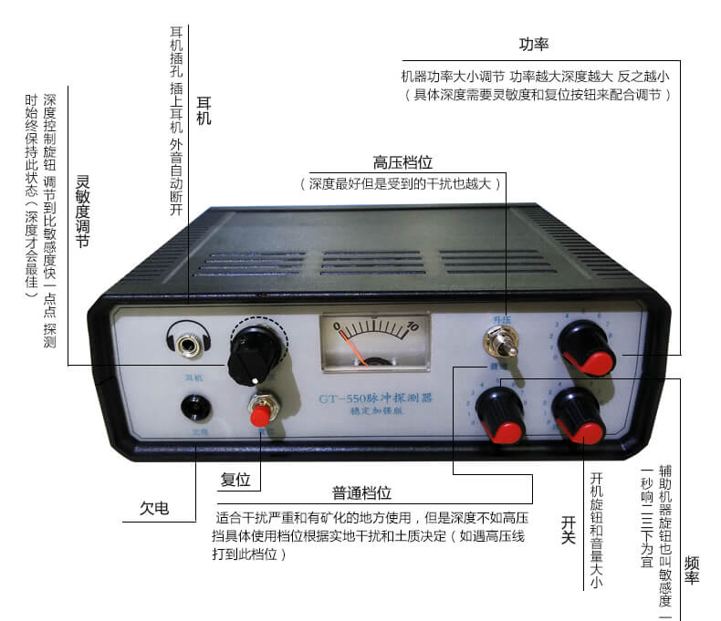 操作方法:開關:開機旋鈕和音量大小功率:機器功率大小調節 功率越大深度越大 反之越?。ň唧w深度需要靈敏度和復位按鈕來配合調節)