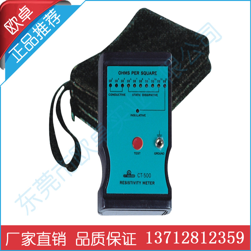 CT-500可測量材料的表面電阻值,也可以測量設備的表面電阻及其接地狀況。遵循ASTM標準D-257測試方法。(A)測量材料表面電阻系數:只需將CT-500背面的兩條導電極緊貼被測物,按下紅色“TEST”按鍵,儀器上代表電阻系數的LED將被點亮。(B)將連接線的插頭插入⊥的接孔,另一端夾子夾住接地點CT-500后的電極緊貼被測設備,按下紅色按鍵,LED表示的電阻值為被測設備的表面電阻系數。