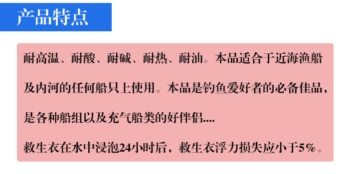 特點: 耐高溫、耐酸、耐堿、耐熱、耐油。本品適合于近海漁船及內河的任何船只上使用。本品是釣魚愛好者的必備佳品,是各種船組以及充氣船類的好伴侶....