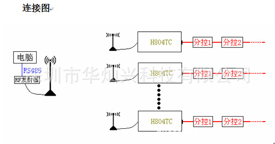 RF無線同步主控H804TC,是靠接收RF無線控制臺發出的控制信號來進行同步的,控制半徑20Km,主控數目不限??烧{節燈具亮度,播放速度,更換播放文件。所有主控可以統一控制,也可以分區或單獨控制。
