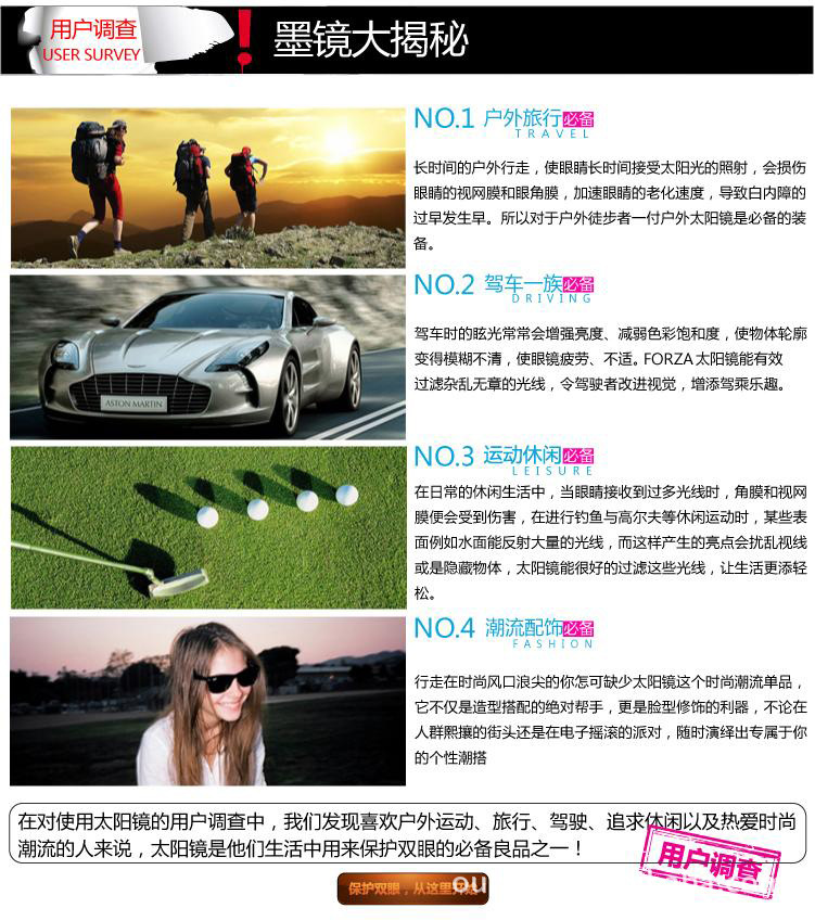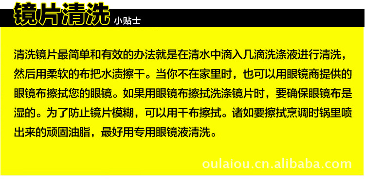 【眼鏡的保護】 1、單手摘戴會破壞鏡架左右平衡性,導致變形,建議大家雙手拿住鏡腿沿臉頰兩側平行方向摘戴。 2、取戴時一般先折左鏡腿,不易造成鏡框變形。 3、建議清水沖洗眼鏡并用紙巾吸干水份,再使用專用眼鏡布試擦,需托住擦拭鏡一側的鏡框邊絲,輕輕拭擦鏡片,避免用力過度造成鏡框或鏡片的損傷。 4、不戴眼鏡時,請用眼鏡布包好放入眼鏡盒。若暫時性放置,請將眼鏡的凸面朝上,否則易***鏡片。同時,眼鏡應避免與防蟲劑、潔廁用品、化妝品、發膠、藥s品等腐蝕性物品接觸,避免長期陽光直射和高溫(60℃以上)放置,否則易引起鏡片、鏡架劣化、變質、變色等。 5、定期到專業店進行整形調整,鏡架變形會給鼻子和耳朵造成負擔,鏡片也易松脫。 6、請勿在激烈運動中使用眼鏡,避免強烈沖擊導致鏡片破碎,造成眼睛和面部損傷;請勿使用磨損鏡片,防止光線散色引起視力下降;請勿直視太陽或強烈刺眼光線,以免眼睛受到傷害。 7、太陽眼鏡的保養 炫麗的太陽眼鏡讓您活躍在陽光下,好自由。其實太陽眼鏡擋得住陽光,可擋不住污染損傷,所以要細細呵護,免得面子掛不住喔。 其實保養太陽眼鏡的方法就像保養一般眼鏡,清洗、收疊、存放都要養成習慣。只不過太陽眼鏡經常脫脫戴戴,一不小心就會刮傷,所以有一些小細節要特別提醒您:太陽眼鏡有污點粘附時,可別用指甲去摳,很容易就會刮傷傷表面的。 太陽眼鏡不戴時,許多人會順手掛在頭上、領或是口袋上,此時身體的動作幅度可別太大,以免扯斷或撞壞?;蛘哂腥藭胚M手提包內,建議您還是先放進硬質的眼鏡盒后,再放進手提袋,以免被鑰匙、梳子、銅板等小東西磨損鏡片,或沾染到口紅等化妝品。