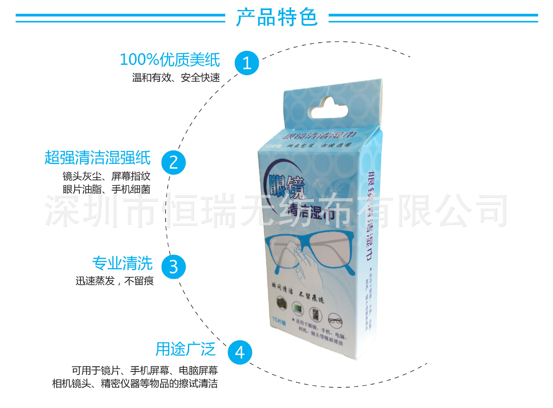產品特點: 只需輕輕擦拭,便可立刻去除鏡片 手機屏幕 液晶電腦 鼠標鍵盤上的指紋、油脂、污垢,使產品立即清潔明亮。本品為速干型濕巾,不掉毛屑,無水痕。無需擦干。獨立包裝,攜帶方便。旅游出差的***用品。