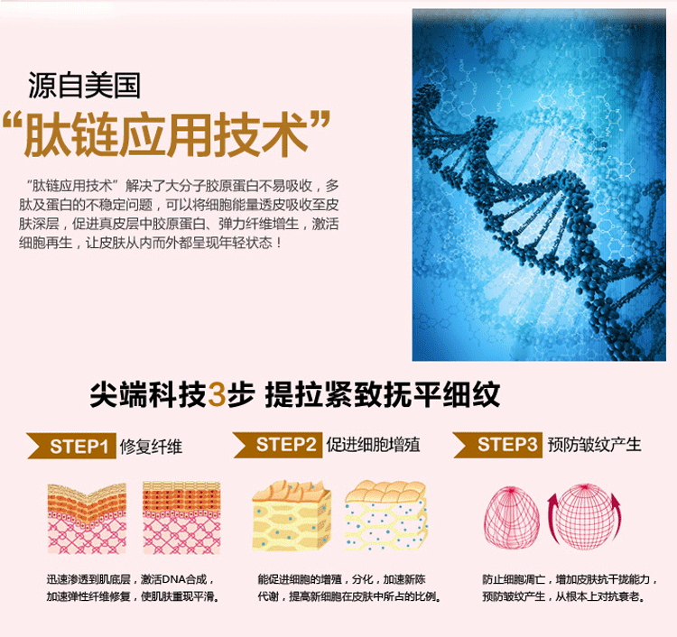 1、這是一款功效性——抗衰的原液,源自美國“肽鏈應用技術”,風靡***生物科技抗衰,給你溫柔的潔凈,卸妝、深層清潔、保濕三效合一,使護膚流程簡單有效。