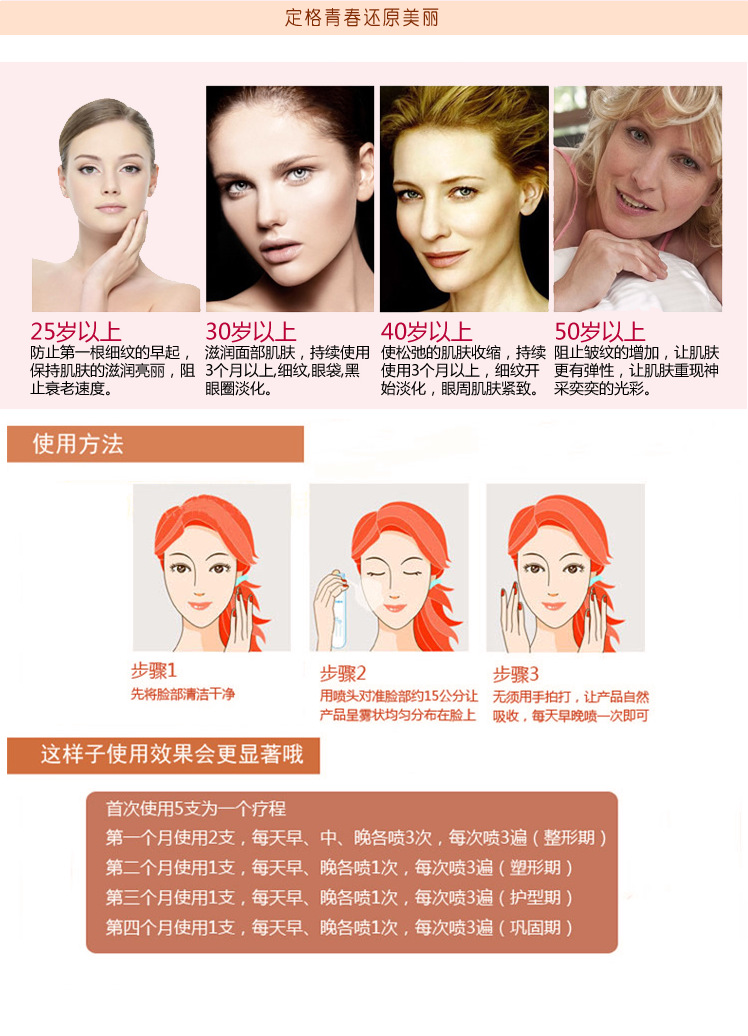 4、***使用5支一療程,第一個月早中晚噴一次,接下來早晚噴一次