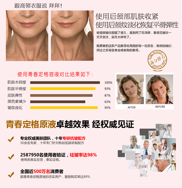 2、一瓶多效,八維度***肌膚,淡化臉部歲月痕跡;整體提亮皮膚亮度和光澤度;瓦解黑色素,均勻提亮膚色;修復各種皮膚瑕疵,使皮膚變得均勻;改善暗沉,去黃氣,提升皮膚元氣;撫平魚尾紋、法令紋等各種皮膚細紋、皺紋;分散去除臉頰紅斑、泛紅及紅血絲;改善皮膚粗糙度,使皮膚變得柔嫩,宛若新生。