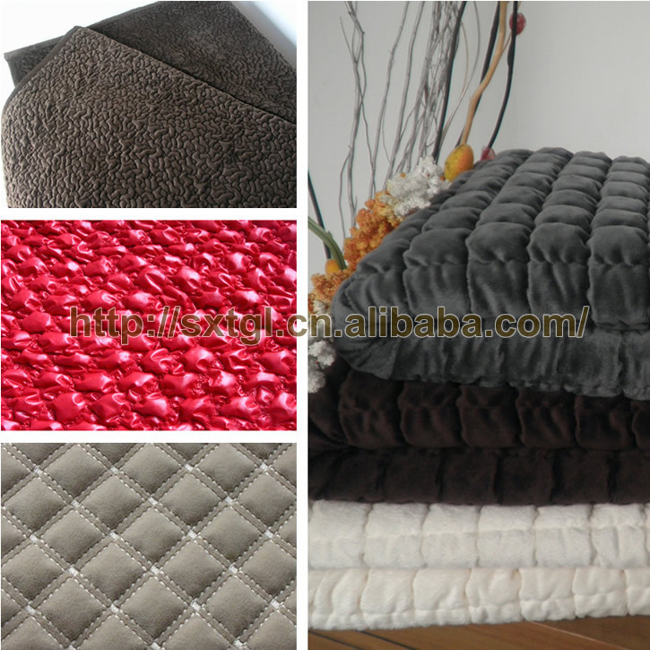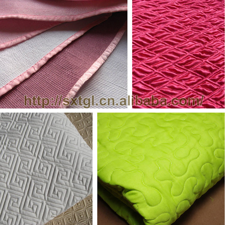 床上用品:可加工各種雙面絨、棉類等面料。門幅可達3.3米,添加不同厚度的絲棉運用不同的花型與起縐起泡等特殊工藝,創造溫馨家居高品質生活。