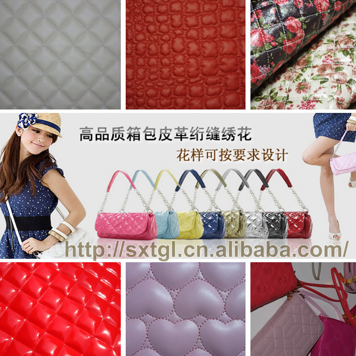 箱包面料:可加工各種厚度PVC PU皮革、牛津布、化纖面料等。并可應用橡筋起 縐網布起泡等特殊工藝,高品質,多種花樣組合,滿足現代化高要求市場需求。