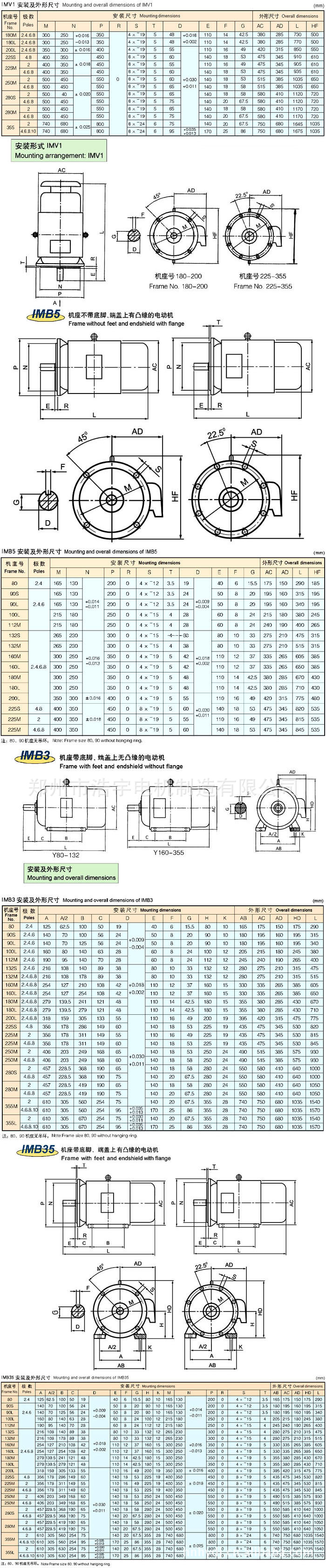 Y系列電機中心高80-355mm。絕緣等級為B級,外殼防護等級IP44,冷卻方式IC411?;景惭b方式有IMB3、IMB5、IMB35、V1、V3等。工作方式:S1連續工作制,環境溫度-15— +40℃,海拔1000米以下。電壓380V,頻率50HZ。接法:3KW及以下為Y接,4KW及以上為△接。