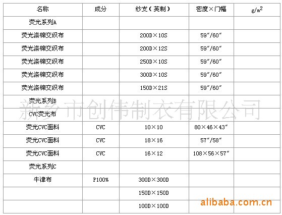 一、熒光面料:滌棉交織布熒光、T/C熒光。滌綸布熒光、腈氯綸/棉熒光。均可達到EN471標準,且擁有熒光度證書.