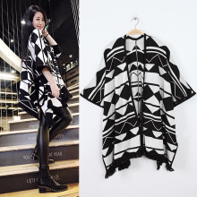 2015歐洲站秋裝新款左岸瀟同款黑白格紋流蘇斗蓬披肩外套針織開衫85.00