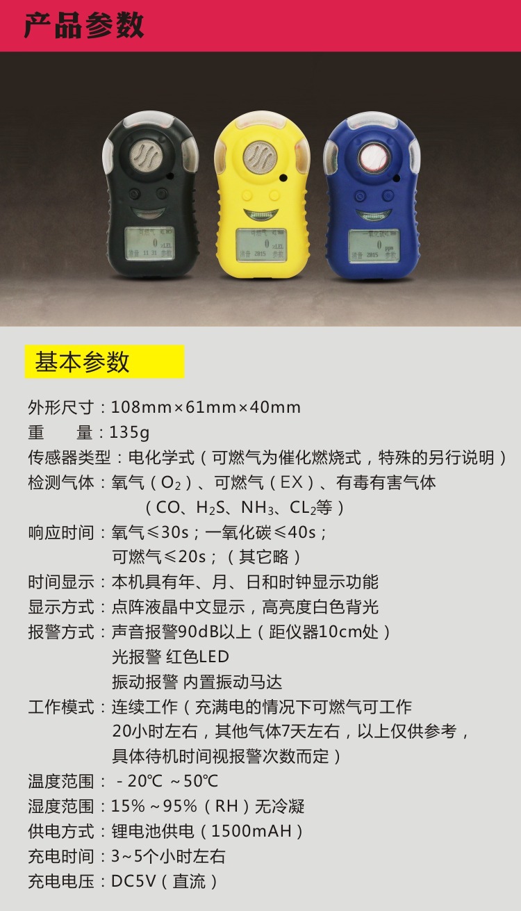 便攜式單一氣體檢測儀,是一種可連續檢測作業環境中有毒有害、易燃易爆氣體濃度的儀器。檢測儀為自然擴散方式檢測氣體濃度,采用進口傳感器,具有良好的靈敏度和出色的重復性;開機自動檢測,具有***的自診斷和自修復功能;儀器采用嵌入式微控制技術,菜單操作簡單,功能齊全,可靠性高,具有多種自適應能力;使用液晶漢字顯示屏,直觀清晰;故障及欠壓指示,屏幕顯示可旋轉180度,可方便不同習慣者使用,人體工學設計,握感舒適、操作簡單。本儀器可以保存3000條報警記錄,可按鍵查看或者通過USB接口將數據傳輸至計算機,配上位機軟件后可進一步分析;可設置報警點、標定、以及讀取、打印、保存報警記錄等;1500mAh大容量鋰電池,大大提升設備續航時間;采用USB接口充電,通用充電器充電方便。