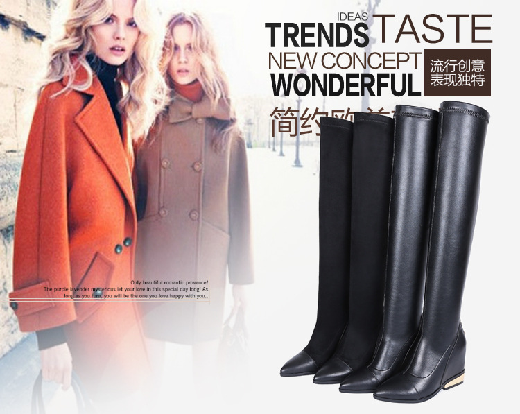 歐美***彈力過膝長靴馬丁皮靴秋冬新款尖頭內增高坡跟***女靴