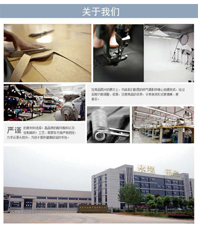 廣東永燦箱包是一家***研發、設計、生產學生書包,背包,戶外旅行包,訂制、貼牌、OEM代加工的廠家, 產品主要出口歐洲、美國、日本、韓國等***,曾為品牌迪斯尼(Disney)芭比、Hello Kitty 、TRANSFORMERS/變形金剛、阿迪達斯、耐克、李寧、Jansport 、Caran·Y/卡拉羊、愛華仕、大嘴猴等品牌代工,內銷品牌YOUNGSUNSTAR深受國內客戶的喜愛,榮獲國內價性格比高的品牌之一。歡迎社會各界合作、洽談、咨詢: