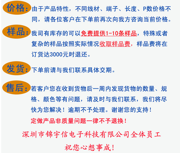 我公司位于繁華的電子產品生產基地——深圳,***各種端子線、排線、電子線、硅膠線、導線、LED模組線等各類連接器件,廣泛應用于各類大小家用電器,電工電器,電子設備,電子儀器,LED燈具,照明設備,電腦等行業。