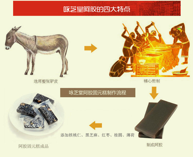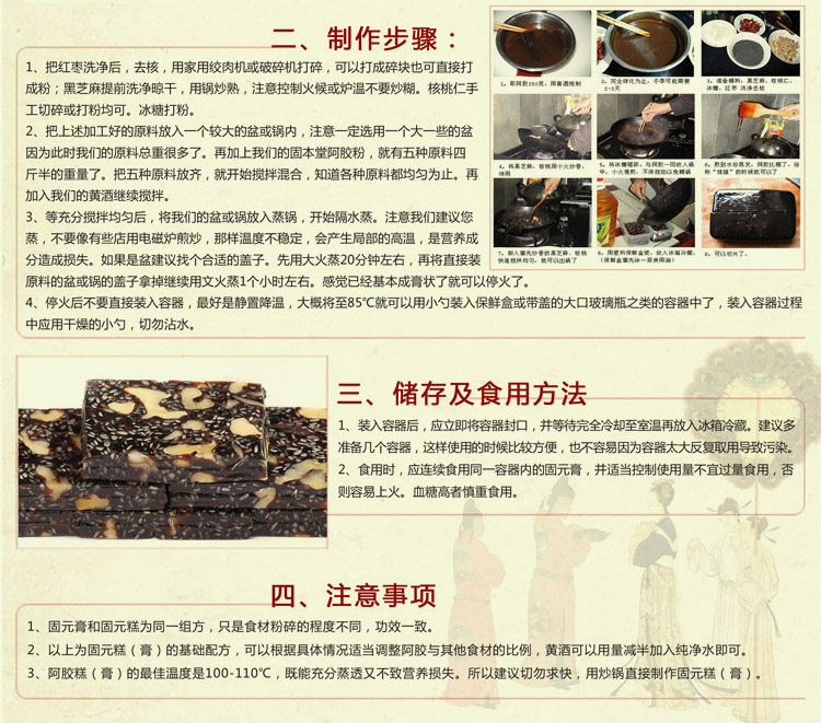 產品介紹:***地道山東阿膠,輔以黑芝麻、核桃仁、紅棗、桂圓、冰糖、黃酒等名貴中