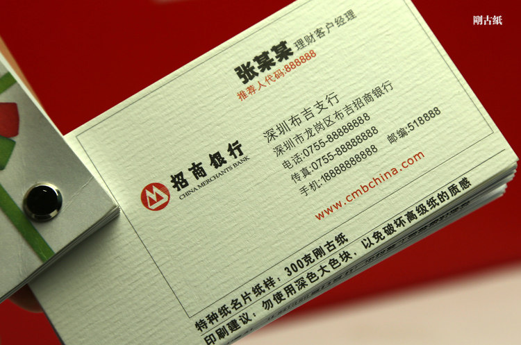 剛古紙名片印刷表面紋路富有變化,有凹凸感,儒雅深沉,古色古香。政府部門、銀行等國有企業經常用該款紙張印刷名片。