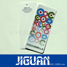服裝吊牌,質地上看,吊牌的制作材料大多為紙質,也有塑料的、金屬的。另外,還出現了用全息防偽材料制成的新型吊牌。