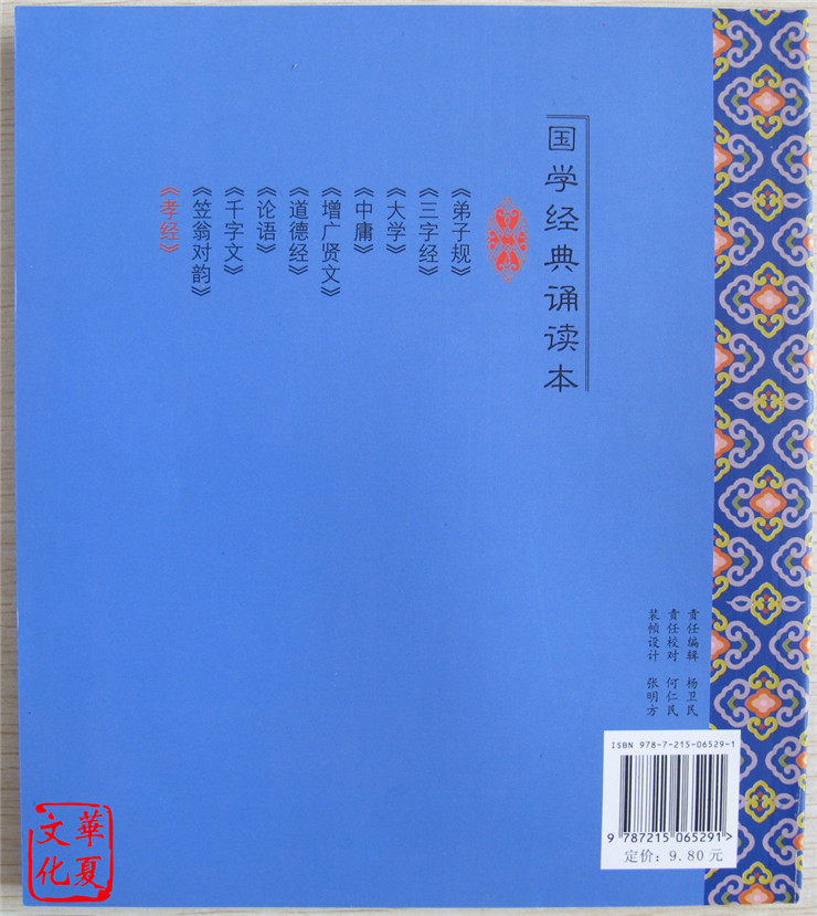 《三字經》、《弟子規》、《千字文》、《大學》、《中庸》、《增廣賢文》、《論語節選》、《道德經》、《笠翁對韻》、《孝經》《治家格言》。