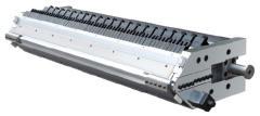 衣架式結構淋膜模頭。在模唇部可得到連續無阻攔的流面,裝有微小間隔的推拉式調節螺釘對樹脂的壓力與金屬的上下反彈起作用,可彎曲柔性模唇以調節??陂g隙具有內堵式,外堵式調節裝置調節產品寬度。表面全部鍍硬鉻,緊固件采用12.9級高強度螺栓,采用優質,耐用不銹鋼加熱棒分區控制加熱。生產穩定,結構簡單,便于拆卸,清理。生產0.02mm-0.8mm厚的流延膜,適用產品紙張,無紡布,鍍鋁膜,鋁箔,編織袋等。適用:PP, , PE, TPU, PP, PE, EVA, CPE等原料。模具幅寬300-6000mm 。