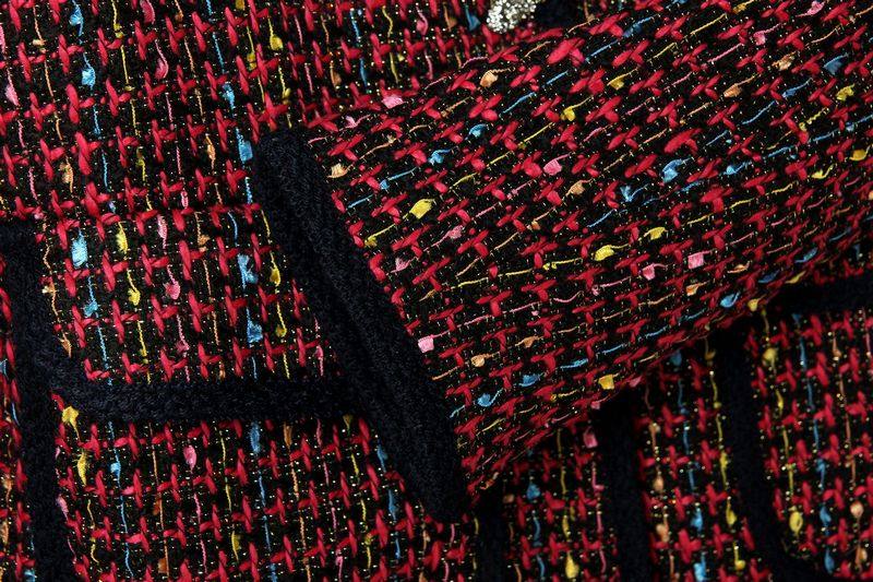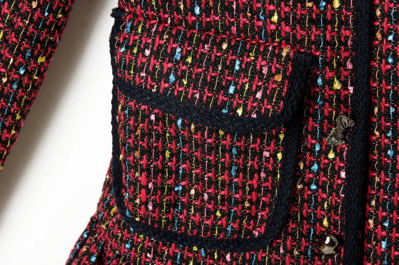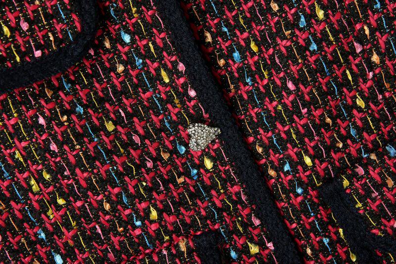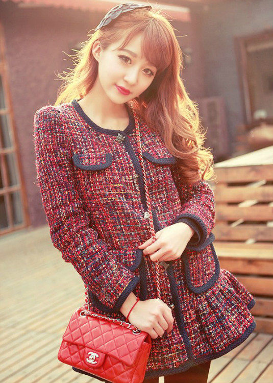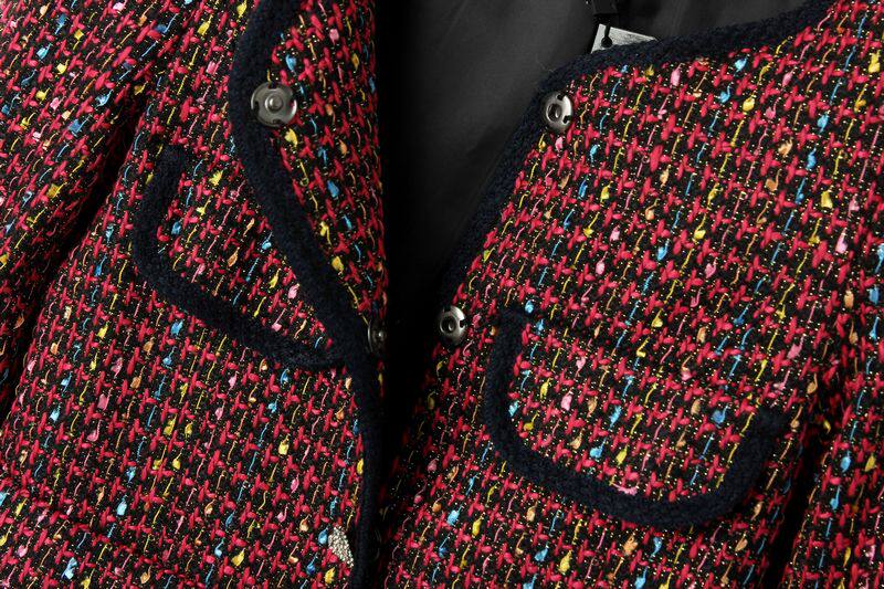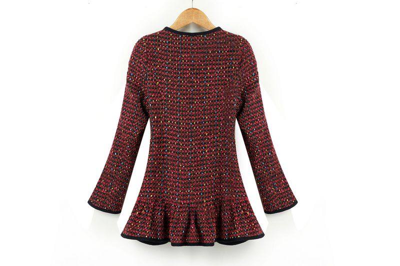 2014歐美秋冬女新款彩色粗花呢口袋裝飾荷葉擺中長款毛呢外套批發