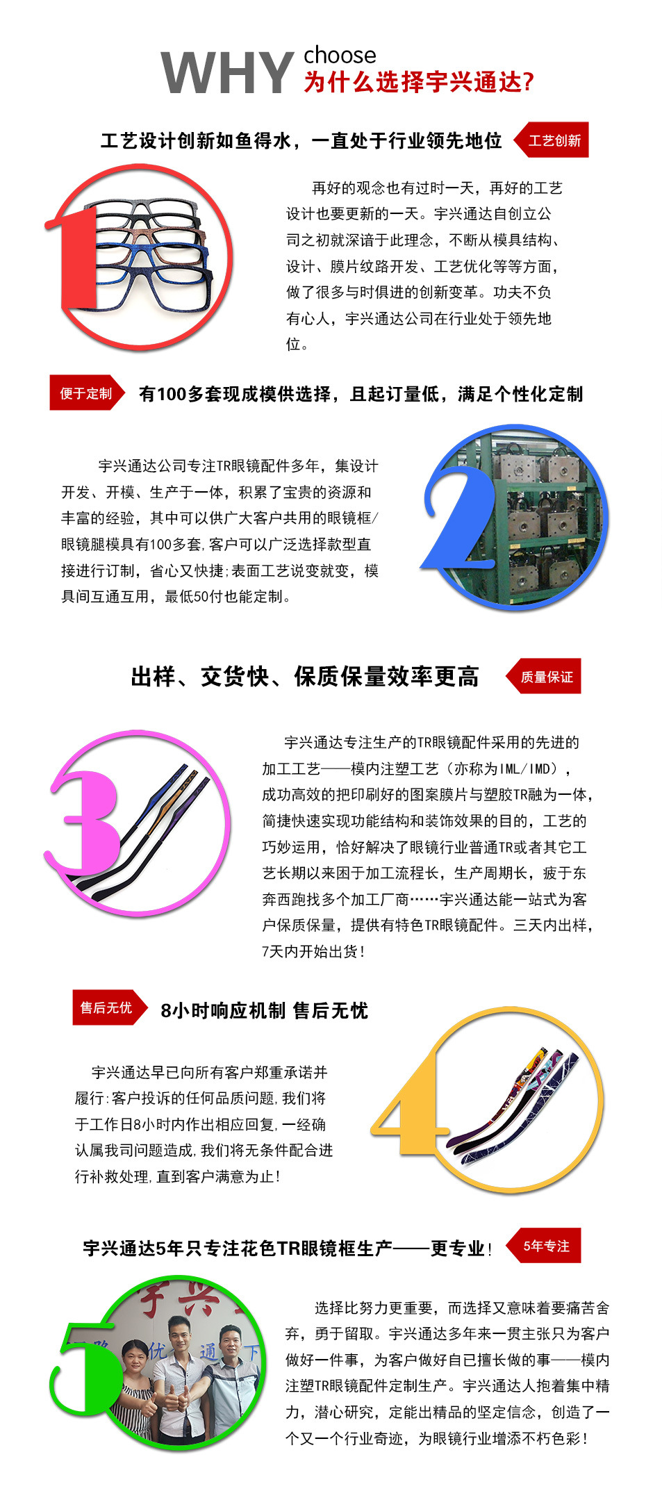宇興通達眼鏡配件采用先進技術——模內注塑枝術,即將已印刷好的圖案膜片放入塑膠模內注塑,而后緊密貼合,最后實現結構功能及裝飾雙重效果的過程。使得眼鏡框美觀、時尚、高端大氣,同時有抗老化,防輻射等特性,能通過30多項可靠性測試。