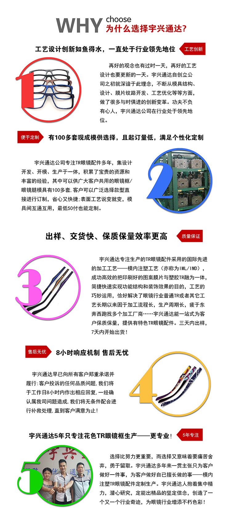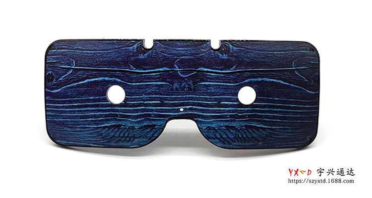 宇興通達花色TR眼鏡配件采用先進技術——模內注塑枝術,木紋光學眼鏡框架即將已印刷好的圖案膜片放入塑膠模內注塑,而后緊密貼合,最后實現結構功能及裝飾雙重效果的過程。使得花色TR眼鏡框美觀、時尚、高端大氣,同時有抗老化,防輻射等特性,能通過30多項可靠性測試。